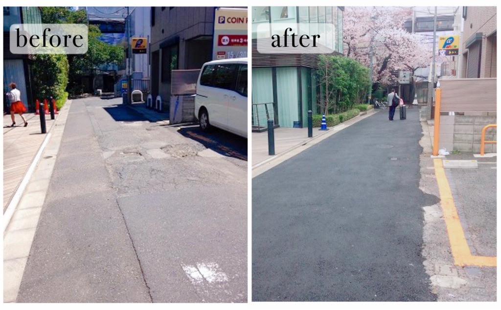 →ある地元の住民の方から、「近くの道路が陥没しており、自転車通行が危険なため道路の補修を役所に相談したところ、私道のため役所では修理できない旨回答があり、補修に協力してほしい」と連絡があった。私道を調査したところ5人の共有名義になっており、共有者全員の住所地を調査し連絡することで補修の承諾をとり、港区と協議をし、約1年がかりで道路補修がなされた。
